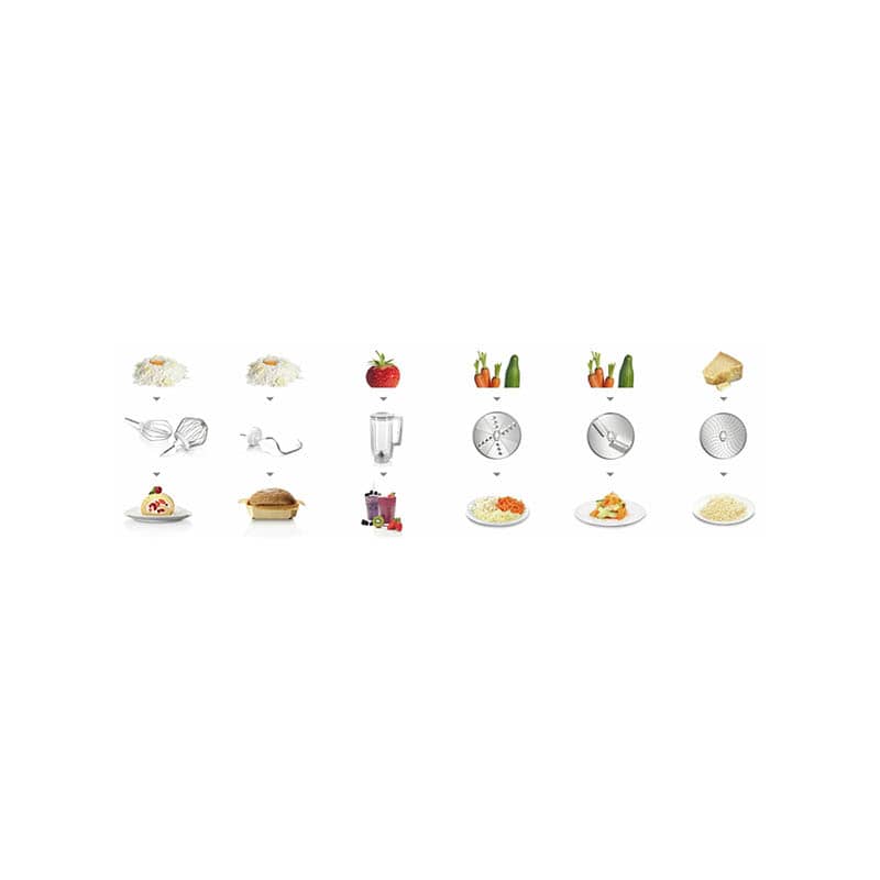 معرفی ماشین آشپزخانه بوش BOSCH MUM58720ماشین آشپزخانه بوش MUM58720 با تنظیمات سرعت 7 حالته و قدرت موتور 1000 واتی، دارای قابلیت همزن، خمیرزن، مخلوط کن، غذاساز، سس زن و … است. این ماشین آشپزخانه چندکاره دارای مخلوط کنی از جنس پلاستیک است که ظرفیت آن حدود 1.25 لیتر میباشد.تیغه این دستگاه از نوع Supercut بوده و از جنس استیل ضد زنگ ساخته شده است.دارای 3 عدد دیسک ( دیسک رنده ریز و درشت) + (دیسک برش ورقه ای نازک و ضخیم) + ( دیسک آسیاب یا خردکن)برای این ماشین آشپزخانه پایه لاستیکی برای ثبات بیشتر طراحی شده و دارای محفظه برای جمع كردن سیم برق است.مجهز به قفل ایمنی درپوش