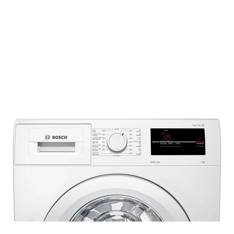 ماشین لباسشویی بوش BOSCH مدل WAJ20170SGC با رده انرژی +++A جزء لباسشویی های کم مصرف و پر طرفدار شرکت بوش میباشد. لباسشویی 20170 دارای ظرفیت 7 کیلوگرم بوده که مناسب برای خانواده هایی با جمعیت متوسط میباشد. طراحی دیگ به صورت موجدار بوده که موجب شستشوی آرام و کارآمد البسه میشود. پنل این لباسشویی دارای نمایشگر دیجیتال ، کلید های تنظیم عملکرد و ولوم چرخشی برای تنظیم برنامه ی شستشو میباشد. برنامه های شستشو شامل شستشوی الیاف نخی با دما های 20 ، 40 ، 60 و 90 درجه ، شستشوی اقتصادی با دمای 40 و 60 درجه ، شستشوی الیاف ظریف ، پشمی ، ملحفه و شستشوی سریع 15 دقیقه ای میباشد. توسط کلید های تنظیم عملکرد نیز میتوان قابلیت VarioPerfect ، speedPerfect و عملکرد شروع با تاخیر را تنظیم نمود. از طریق قابلیت Vario Perfect در این لباسشویی میتوان متناسب با نوع لباس ، برنامه شستشو را انتخاب نمایید که موجب صرفه جویی 65 درصدی در زمان و 50 درصدی در مصرف انرژی میشود.